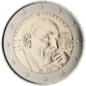 Die Rückseite der Münze zeigt eine detaillierte und ansprechende Darstellung von François Mitterrand in einer nachdenklichen Pose. Um sein Porträt herum sind symbolische Elemente integriert, darunter die Eiche mit dem Olivenzweig – ein persönliches Symbol des ehemaligen Präsidenten, das für Stärke und Frieden steht. Die Jahreszahlen „1916“ und „2016“ markieren sein Geburtsjahr sowie den Gedenkzeitraum zu seinem 100. Geburtstag. Zusätzlich ist sein Name über dem Motiv eingraviert, während das Kürzel des Ausgabestaates „RF“ für République Française unten platziert ist. Der äußere Münzring ist mit den zwölf Sternen der Europäischen Union versehen, die den europäischen Zusammenhalt symbolisieren und den Charakter der Euro-Währung unterstreichen.