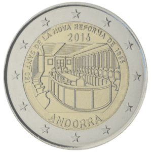 Die Rückseite der Münze ist mit dem äußeren Ring verziert, der die zwölf Sterne der Europäischen Union zeigt. Diese Sterne stellen die Einheit und Solidarität der europäischen Völker dar und reflektieren Andorras Integration in die europäische Gemeinschaft, auch wenn das Land kein offizielles EU-Mitglied ist. Die Symbolik der Sterne unterstützt die Botschaft der Münze, da sie auf die positiven Veränderungen hinweist, die durch die Reformen und die Notwendigkeit eines respektvollen Dialogs zwischen den Institutionen und der Bevölkerung ermöglicht wurden. Anders als viele andere Gedenkmünzen bietet diese spezielle Ausgabe ein Stückblick in die Geschichte Andorras und dessen dynamische Entwicklung in einer sich ständig verändernden Welt.