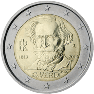 Die Euro-Münze zum 200. Jahrestag der Geburt von Giuseppe Verdi ist eine erinnerungswürdige Gedenkprägung, die die bedeutende Rolle des italienischen Komponisten in der Musikgeschichte ehrt. Auf der Vorderseite zeigt die Münze ein detailreiches Porträt von Verdi im Dreiviertelprofil, das seinen nachdenklichen Blick nach links einfängt. Neben dem Porträt sind die Buchstaben „RI“, das Monogramm der Italienischen Republik, sowie die Jahreszahl „1813“ zu sehen, die Verdis Geburtsjahr markiert. Auf der rechten Seite der Münze findet sich das „R“-Monogramm der Münze von Rom, gefolgt von der Jahreszahl „2013“, die das Ausgabedatum kennzeichnet. Die Graveurin Maria Carmela Colaneri hat ihr Initial „MCC“ sowie Verdis Initialen eingraviert, was der Münze eine persönliche Note verleiht. Rund um das Motiv zieht sich der äußere Münzring, der mit den zwölf Sternen der Europäischen Union verziert ist und die Zugehörigkeit Italiens zur Eurozone unterstreicht.