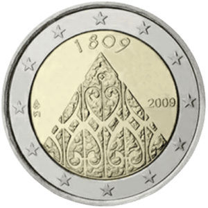 Die Euro-Münze aus Finnland, die 2009 geprägt wurde, feiert den 200. Jahrestag der Unabhängigkeit Finnlands sowie das bedeutende Ereignis der ersten Reichstagsversammlung in Porvoo im Jahr 1809. Diese spezielle Münze ist nicht nur ein numismatisches Sammlerstück, sondern auch eine Hommage an die finnische Geschichte und das kulturelle Erbe. Auf der Rückseite der Münze ist eindrucksvoll der Porvoo Dom abgebildet, der als Symbol für die Eröffnung der ersten Reichstagsversammlung steht. Über dem Dom ist das Jahr „1809“ in stilisierter Schrift zu sehen, während der Ländercode „FI“ links und das Prägejahr „2009“ rechts angebracht sind. Der äußere Ring der Münze wird von den zwölf Sternen der Europäischen Union geschmückt, was die Zugehörigkeit Finnlands zur EU unterstreicht.