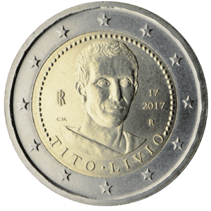 Die Euro-Münze zum 2000. Todestag von Titus Livius wurde im Jahr 2017 von Italien herausgegeben und ist Teil der europäisch harmonisierten Gedenkmünzen. Auf der Rückseite der Münze ist eine detailreiche Büste des römischen Historikers Titus Livius abgebildet, die nach einem Kunstwerk von Lorenzo Larese Moretti gestaltet wurde. Die Abbildung zeigt Livius in seiner klassischen Form, umgeben von symbolischen Elementen, die seine Bedeutung für die römische Geschichtsschreibung unterstreichen. Links neben der Büste befindet sich das Emblem der Italienischen Republik (RI), während auf der rechten Seite die Jahreszahlen „17“ und „2017“ zu sehen sind, die sowohl auf das Todesjahr des Historikers als auch auf das Jahr der Münzausgabe hinweisen. Unterhalb befindet sich das „R“, das als Erkennungszeichen der römischen Münzprägestätte dient. Ein punktierter Kreis und die Inschrift „TITO • LIVIO“ umrahmen das Innere der Münze und verleihen ihr eine harmonische Anmutung. Der äußere Ring ziert die zwölf Sterne der Europäischen Union, die für Einheit und Vielfalt innerhalb der Eurozone stehen.