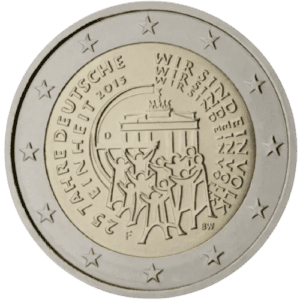 Die Euro-Münze zur Feier von 25 Jahren deutscher Einheit wurde 2015 geprägt und spiegelt ein entscheidendes Ereignis in der deutschen Geschichte wider. Die Gestaltung der Münze zeigt eine jubelnde Menschenmenge am Brandenburger Tor, das als starkes Symbol für die Wiedervereinigung steht. Das Bild vermittelt den Geist der Freude und des Zusammenhalts, der die Deutschen auf dem Weg zur Einheit prägte. Die Inschrift „Wir sind ein Volk“ erinnert an die bewegenden Momente, als die Menschen für Freiheit und Einheit eintraten. Im Münzinneren sind zudem die Prägeanstalt sowie die Initialen des Graveurs zu sehen, was der Münze eine persönliche Note verleiht. Besonders ist auch der äußere Münzring, der mit den EU-Sternen verziert ist und die Zugehörigkeit zur Europäischen Union symbolisiert.