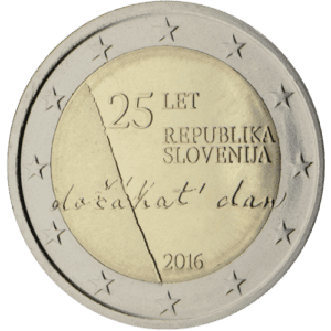Auf der Rückseite der Münze findet sich ein eindrucksvolles Design, das durch eine diagonale Linie in zwei Teile unterteilt ist. Im oberen rechten Bereich prangen die Worte „25 LET“, die den 25. Jahrestag der Unabhängigkeit markieren. Darunter steht in zwei Zeilen „REPUBLIKA SLOVENIJA“, was so viel wie „Republik Slowenien“ bedeutet. Besonders hervorzuheben ist der untere Teil, in dem eine Zeile aus der slowenischen Nationalhymne „Zdravljica“, nämlich „dočákat‘ dan“, in der Handschrift des bedeutenden slowenischen Dichters France Prešeren abgebildet ist. Diese poetische Verbindung verleiht der Münze einen tiefen kulturellen Wert, da Prešeren als einer der größten Literaten Sloweniens gilt. Der äußere Rand der Münze ziert das Symbol der Europäischen Union: die zwölf goldenen Sterne, die den Zusammenhalt und die Einheit der Mitgliedstaaten repräsentieren.