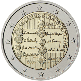 Die Gestaltung der Münze, die von der österreichischen Künstlerin Helga Flock, die für ihre Fähigkeit bekannt ist, bedeutende historische Momente in Kunst zu übersetzen, entworfen wurde, ist reich an Symbolik. Neben den Unterschriften und den Siegeln ist die Inschrift „50 JAHRE STAATSVERTRAG“ sowie die Jahreszahl „2005“ prominent abgebildet. Vertikale Streifen, die die Nationalfarben Rot und Weiß Österreichs repräsentieren, umrahmen die zentrale Darstellung und verleihen der Münze eine besonders patriotische Note. Der Rand der Münze ist mit zwölf Sternen der Europäischen Union verziert, die die Zugehörigkeit Österreichs zur EU unterstreichen und die kulturelle Identität sowie den europäischen Zusammenhalt symbolisieren.