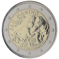 Auf der Rückseite der Münze ist ein detailreicher Ausschnitt aus dem bekannten Gemälde „Die Heimsuchung“ von Tintoretto zu sehen. Das Kunstwerk ist im Zentrum der Münze abgebildet und wird von den Jahreszahlen „1518“ und „2018“ begleitet, die die Relevanz des Jubiläums verdeutlichen. Am oberen linken Rand verläuft der Name des Ausgabestaates „SAN MARINO“ in sanften Kurven, während der Name des Malers Tintoretto im unteren rechten Bereich der Münze eingraviert ist. Die Initialen der Münzgestalterin Luciana de Simoni „LDS“ befinden sich links von dem Münzzeichen „R“, das in Anlehnung an die Prägeanstalt in Rom steht. Rund um die Münze sind die zwölf Sterne der Europäischen Union abgebildet, was die Verbindung zum europäischen kulturellen Erbe herstellt und die Bedeutung der Münze als Teil des Euro-Systems unterstreicht.